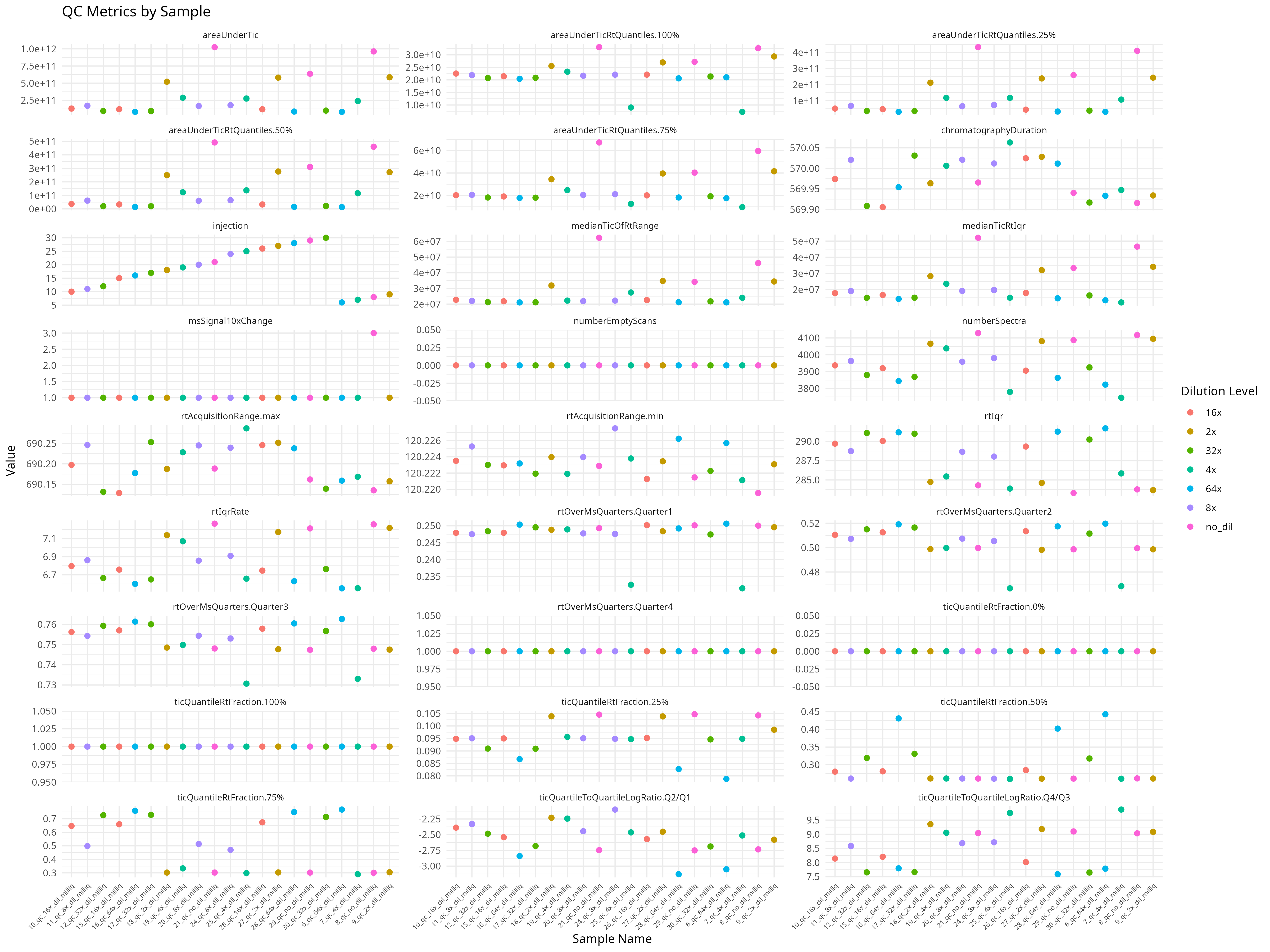 # Plot all metrics by sample ID, colored by dilution level